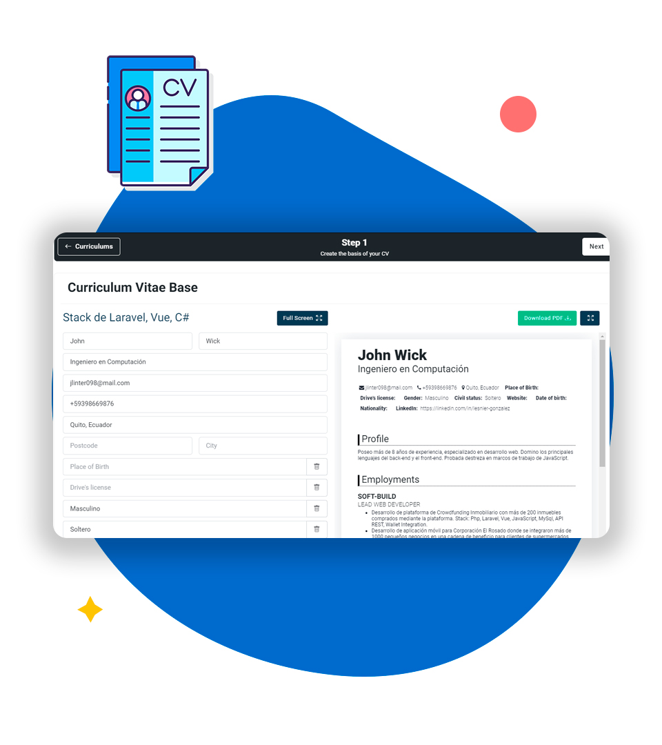 Our AI personalizes your Curriculum Vitae to adapt it to the job description. Let the magic happen.