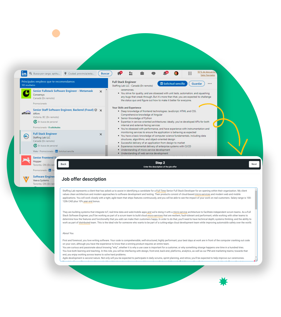 Next, copy and paste the job offer into the text box of our platform. This step is crucial, as our system will analyze the offer to identify the skills, qualities and requirements mentioned by the employer.